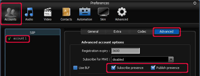 Go to the Advanced tab and enable Publish presence and Subscribe presence.