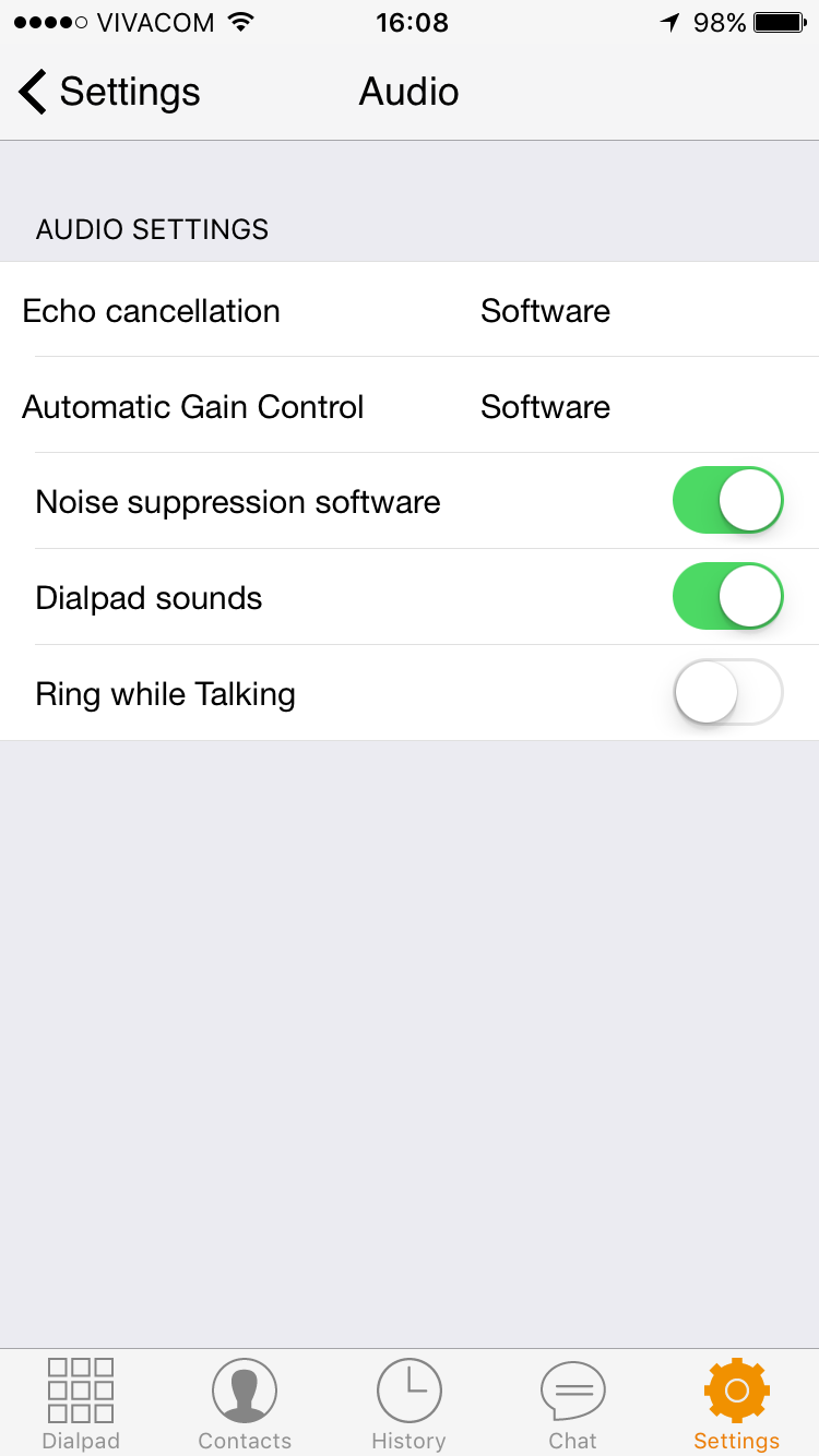 Hardware DSP: Zoiper can do "Echo Cancellation" and "Automatic Gain Control" in software or can leave it to iOS to do it in hardware. Some phones seem to have issues using the hardware mode, if you are experiencing garbled audio and are using hardware mode, please switch to software mode instead.