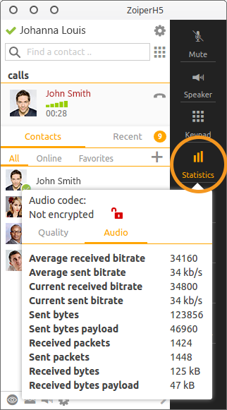 In Zoiper 5 for Mac, you can find the RTCP statistics by clicking on Statistics during an active call.