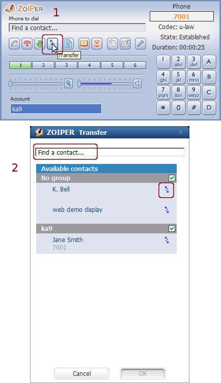 To make a blind call transfer with Zoiper WEB please follow these steps: