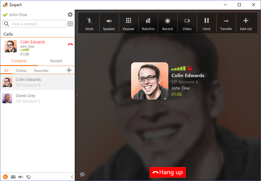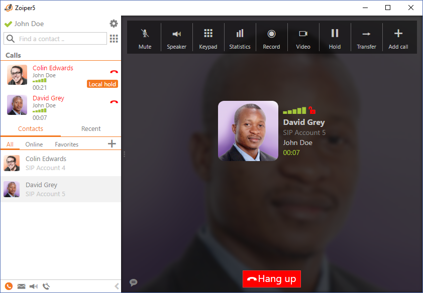 Put the first call on hold manually (by clicking the hold button), or just dial the second number. If you directly dial the second number, the first call will be put on hold automatically. Here, Zoiper 5 gives you much more versatility - you can "dial" the second number either by choosing it from your Contacts list, or by typing it in the Search field.