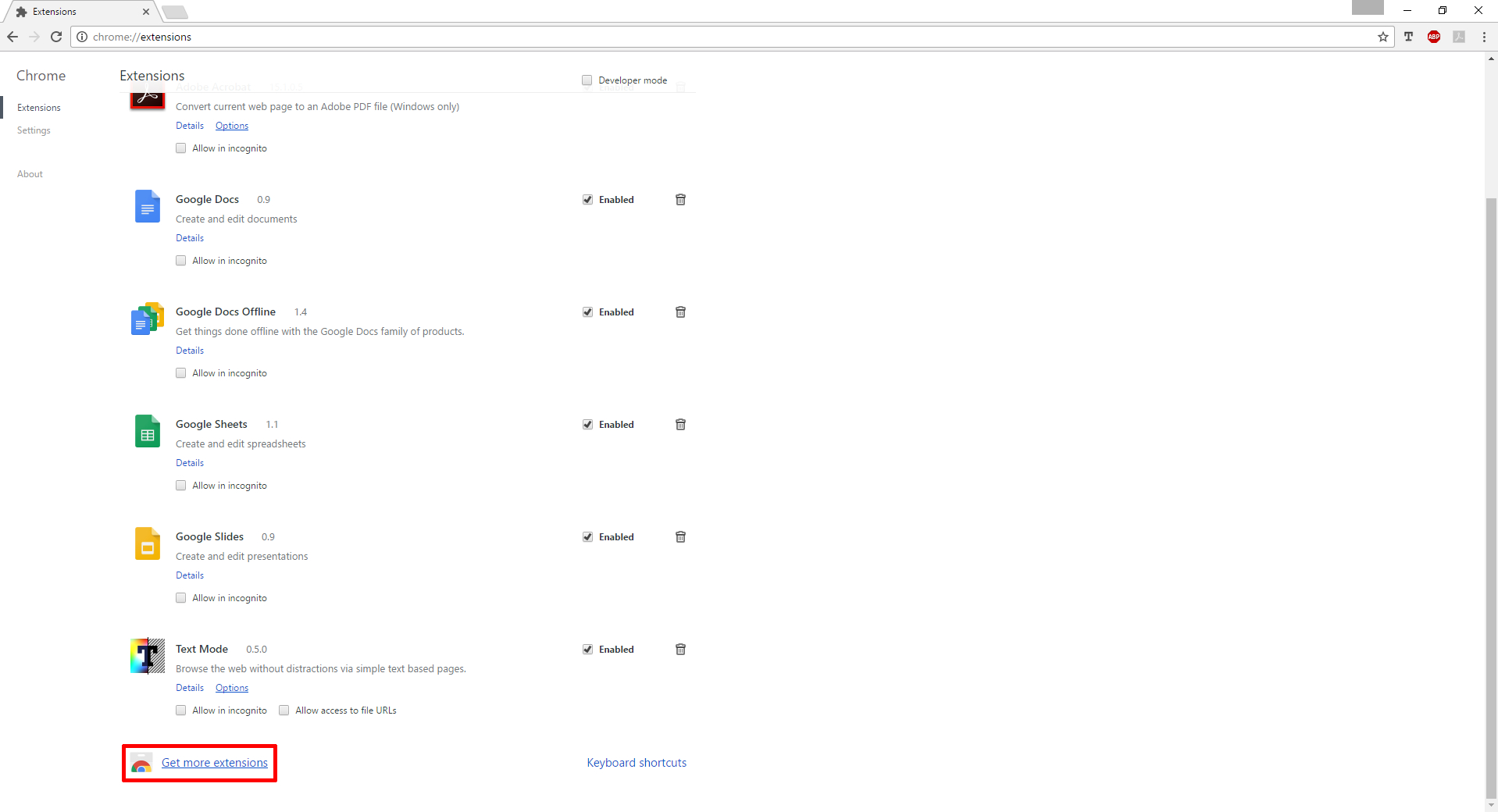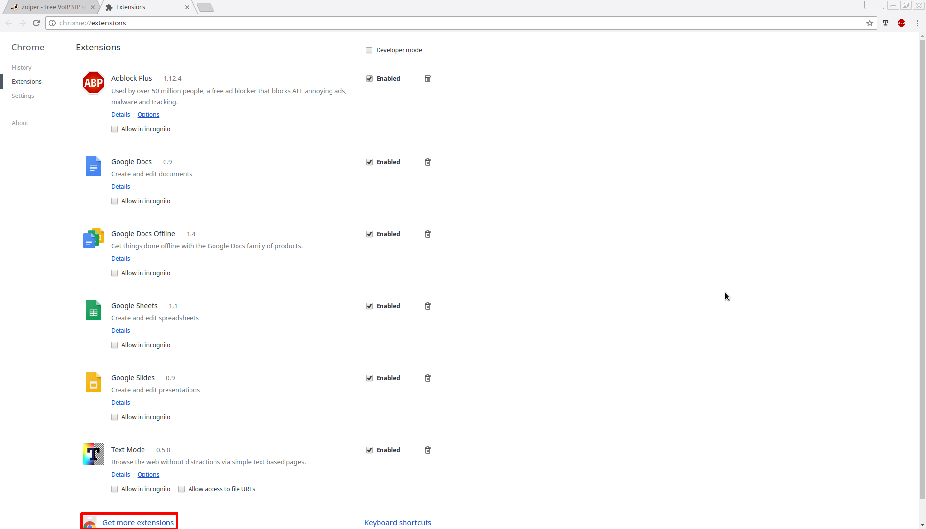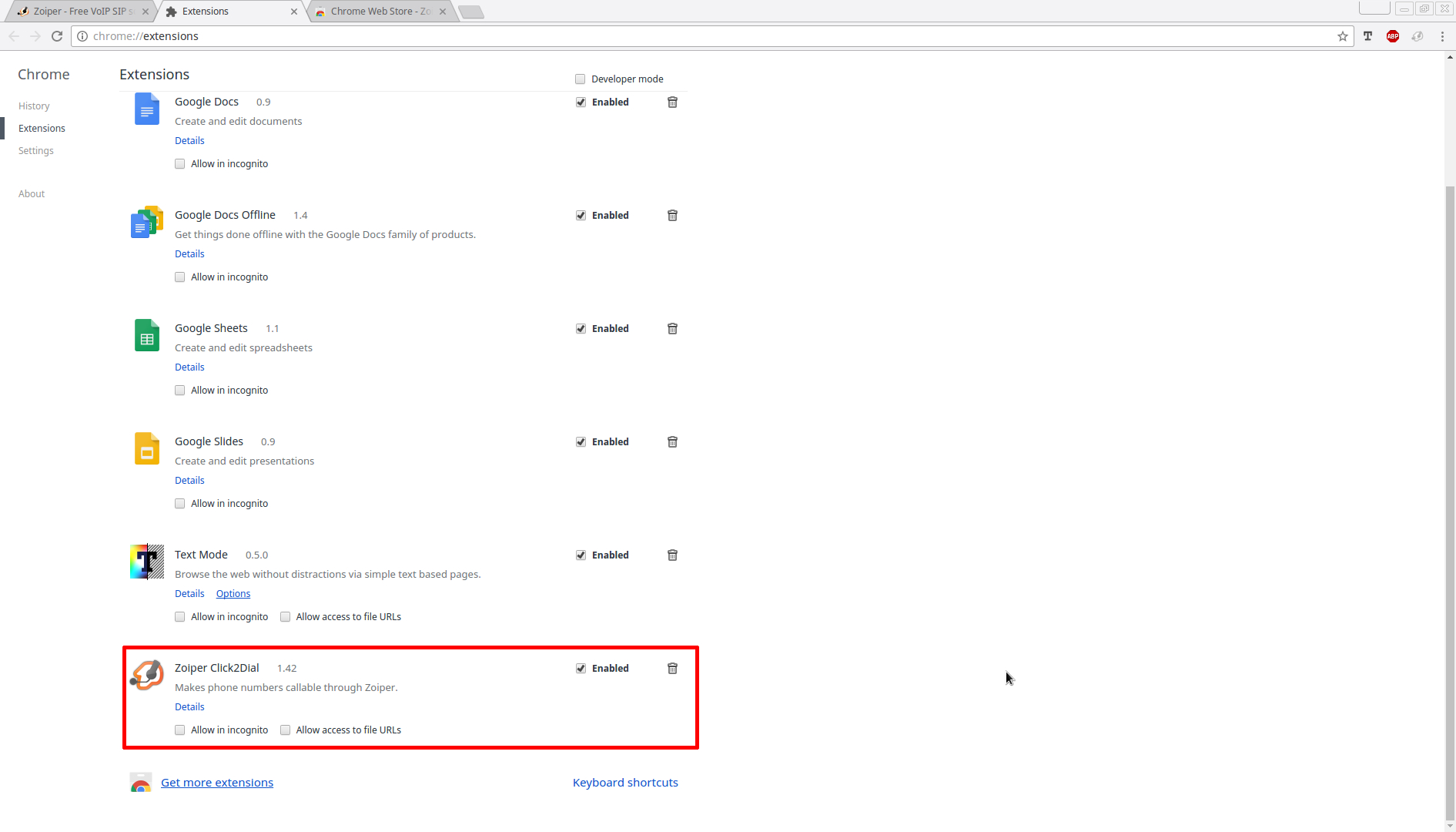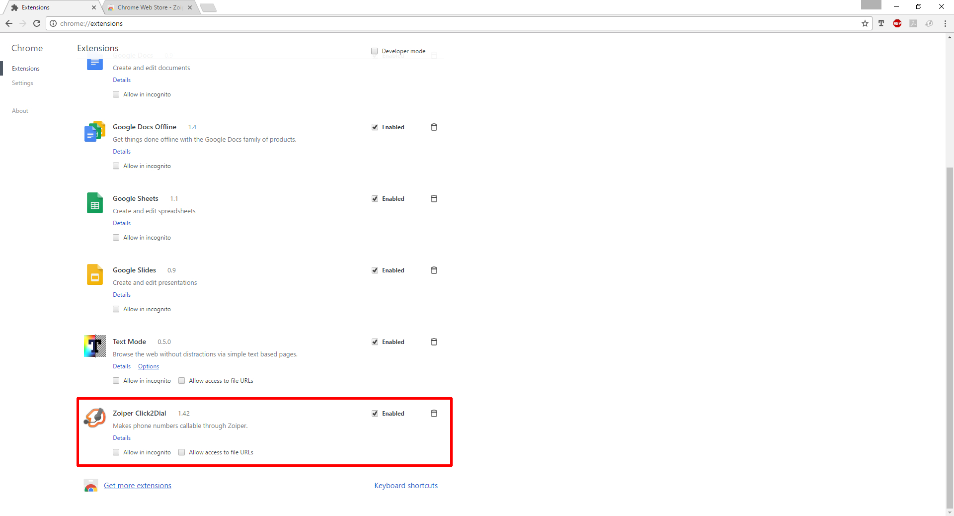 8. Afterwards, you can go back to the Extensions menu in the Chrome's preferences to check if the Click2Dial extension is enabled. (it should be by default)