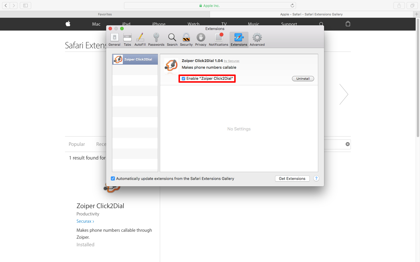 6. You can double-check if the extension is complete by going to the Extensions tab, under Preferences again. If the extension is not enabled, you can do so by clicking the 'Enable "Zoiper Click2Dial" box.