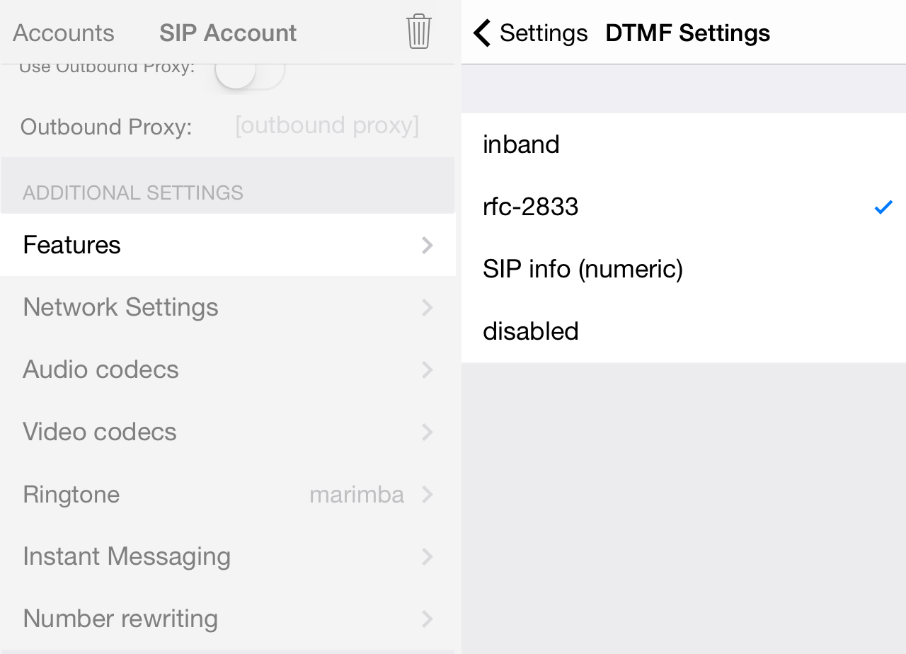 Start Zoiper for iOS and go to Settings -> Your registered account (You should see Account name) -> Features