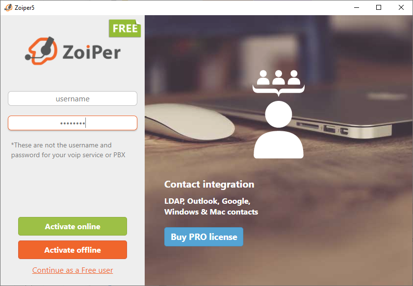 When you click Activate PRO you will see the same Activation screen as above. Enter again Username and Password and activate Zoiper 5!
