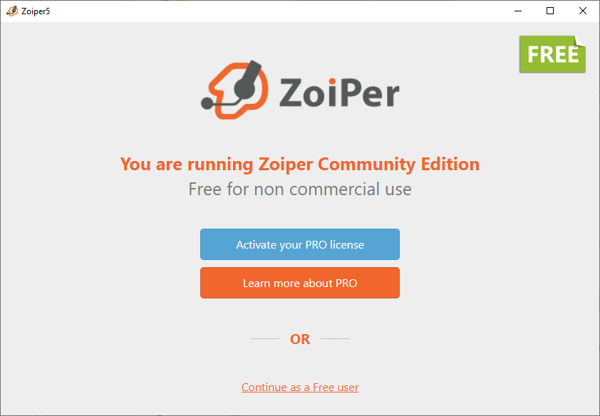 On first start of Zoiper 5, you get a screen where you have a few options - Activate or Continue as a Free user.