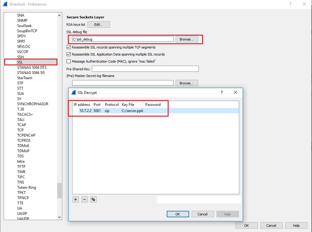 Open Wireshark and go to Edit >> Preferences >> Protocols >> SSL >>Edit and do the exact setup you can see below. Use the file created earlier with the private key.