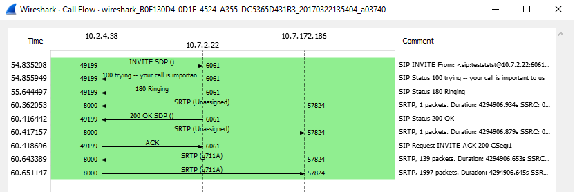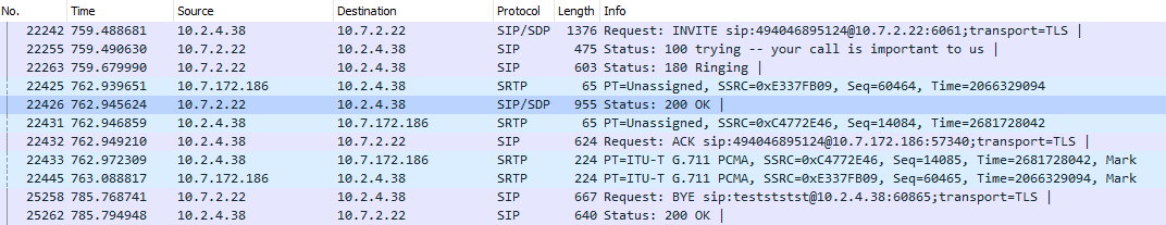 The keys used for encrypting the RTP stream can be found in the SDP portion of a SIP packet. The keys for the calling party can be found in the SIP INVITE message, and the keys for the called party can be found in the SIP 200 OK message. It’s helpful to first sort by SIP in Wireshark, as seen below: