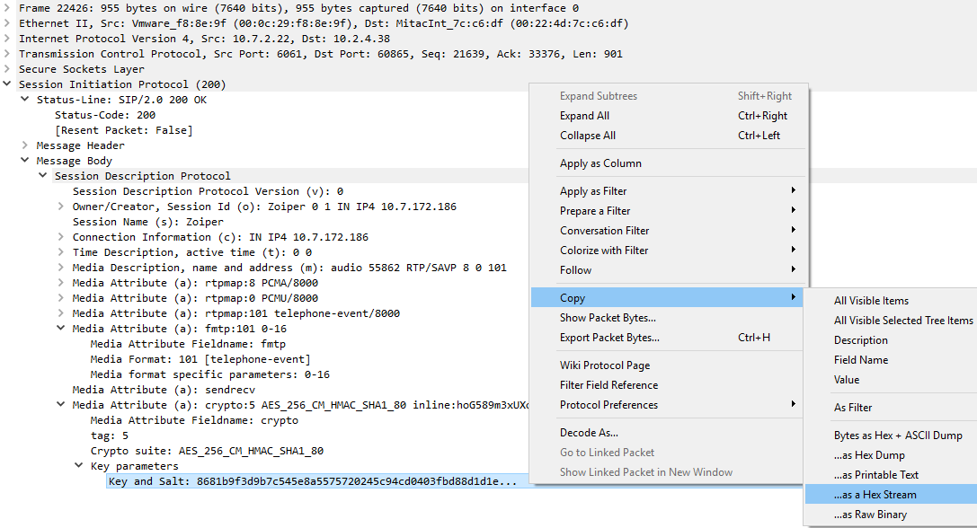 In this example, the calling party is 10.2.4.38, and the called party is 10.7.172.186. For this tutorial, we are only going to decrypt one side of the conversation, namely that of the called party (10.7.172.186). To obtain the key for the called party, we can simply expand the SDP portion of the 200 OK message, which is frame number 4. Below, we can see that the AES_CM_256_HMAC_SHA1_80 crypto suite is used and the "key and salt" is in plain view, with a value of “8681b9f3d9b7c545e8a5575720245c94cd0403fbd88d1d1e....” . You can easily obtain the key and salt value in Wireshark by right-clicking on the field and selecting Copy > ..as a Hex Stream.