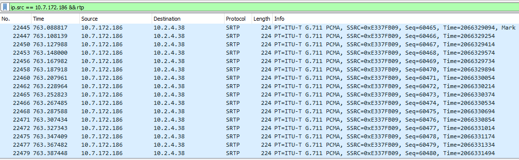 Now that we have the key and salt necessary for decryption, we need to isolate a single RTP stream. Since this is a simple example, with only one RTP stream being sent by each side (just one audio stream), we can do this with a simple Wireshark filter based on IP and protocol, as seen below: