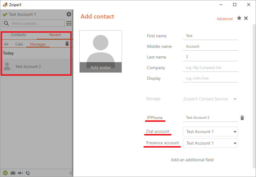 Click on the Add an additional field option on the right hand-side and choose IPPhone as your field type for this contact. Zoiper will automatically set Presence account field to Contact Service. If you select Phone as a field type, the Presence account field will be auto-set to “Do not use”.