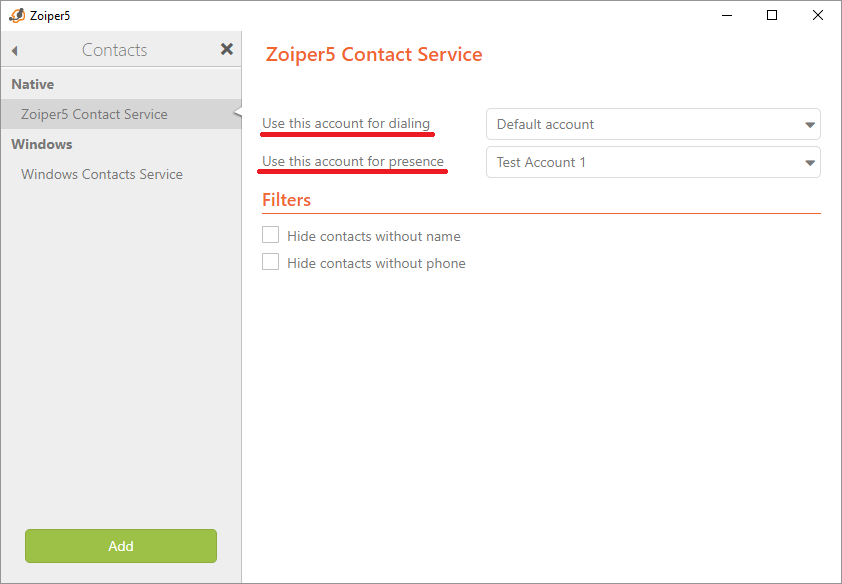 For a more global settings regarding which account you would use by default for dialing and which one for presence, you can set these at Settings > Contacts > Zoiper 5 Contact Service: