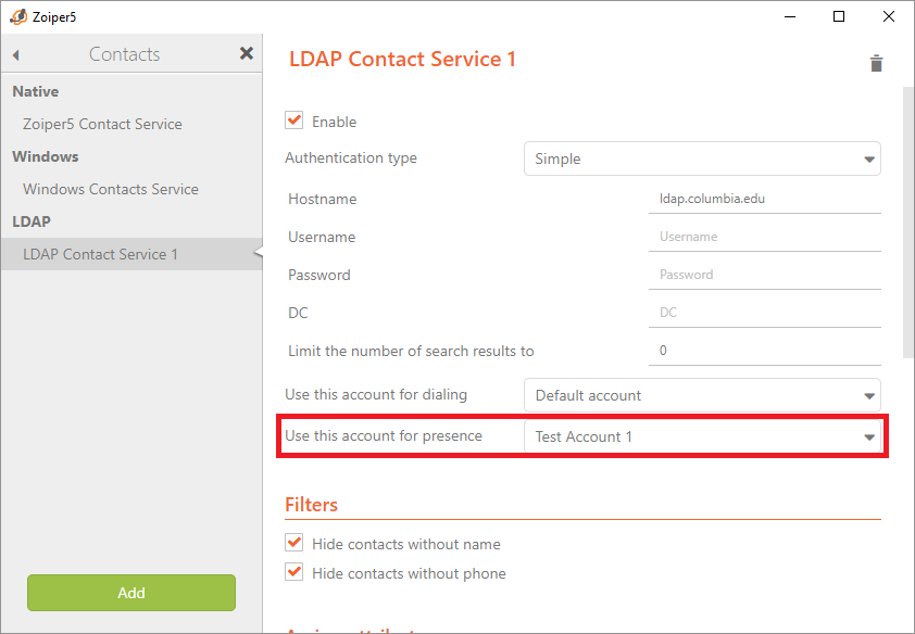 First, we add a new Contact service – LDAP / ActiveDirectory. For testing purposes we are using a test LDAP server.