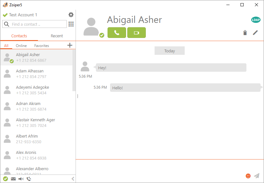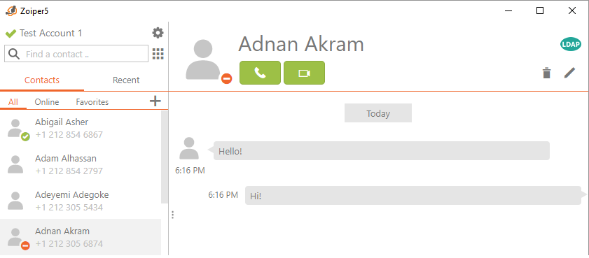 Chat & Presence work and are enabled for Test Account 1 on Zoiper 5 PRO, if we enter another number of a contact from the LDAP contact list, we would get the same result: