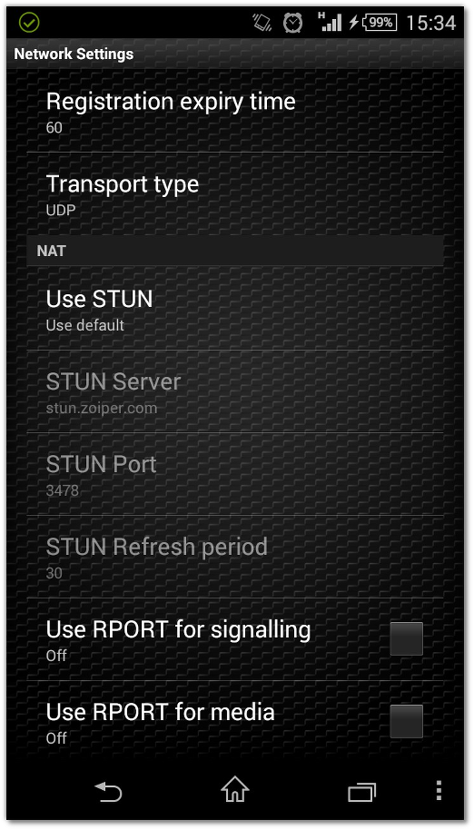 * By default, Zoiper for Android is using stun.zoiper.com. Your provider might have their own prefferred STUN server. If the issue persists, open the Network Settings once again and try enabling or disabling RPORT for media. Save the changes and make a test call.