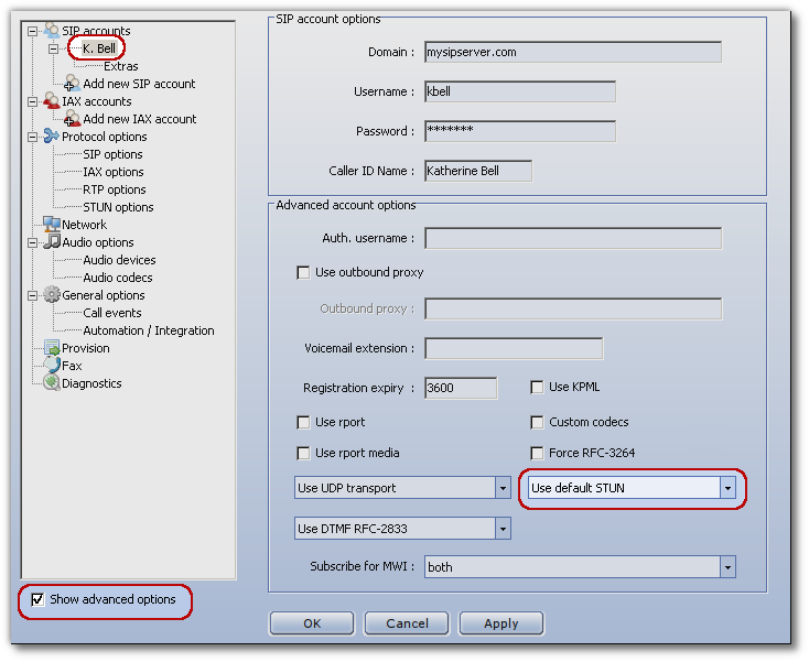 Open the Zoiper options window and enable the "Show Advanced Options" checkbox on the bottom left.
